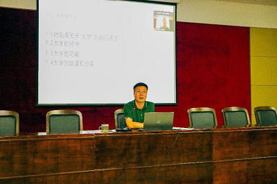 学院副院长刘毅做题为“来大学干什么”的报告,从学院发展历程、学科科研与教学平台建设、课程设置、学习要求、专业考研、就业等情况等方面向同学们做了详细介绍,帮助新生了解专业特点及发展前景,进一步激发学习兴趣,明确学习目标,并引导同学们树立责任意识,志存高远,努力在专业领域练就过硬本领,激励新生努力成为一个有品德、精理论、强实践的新时代青年。