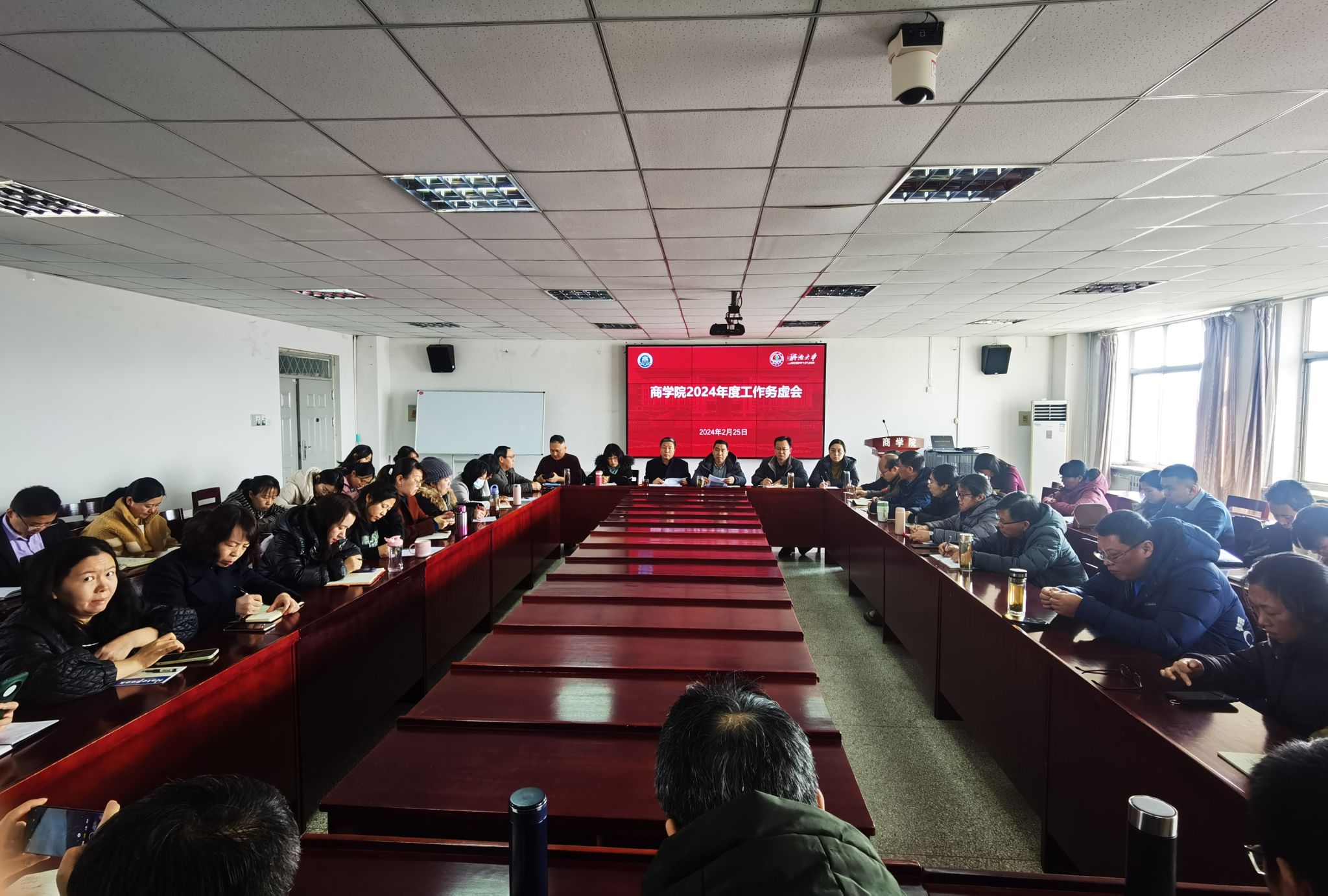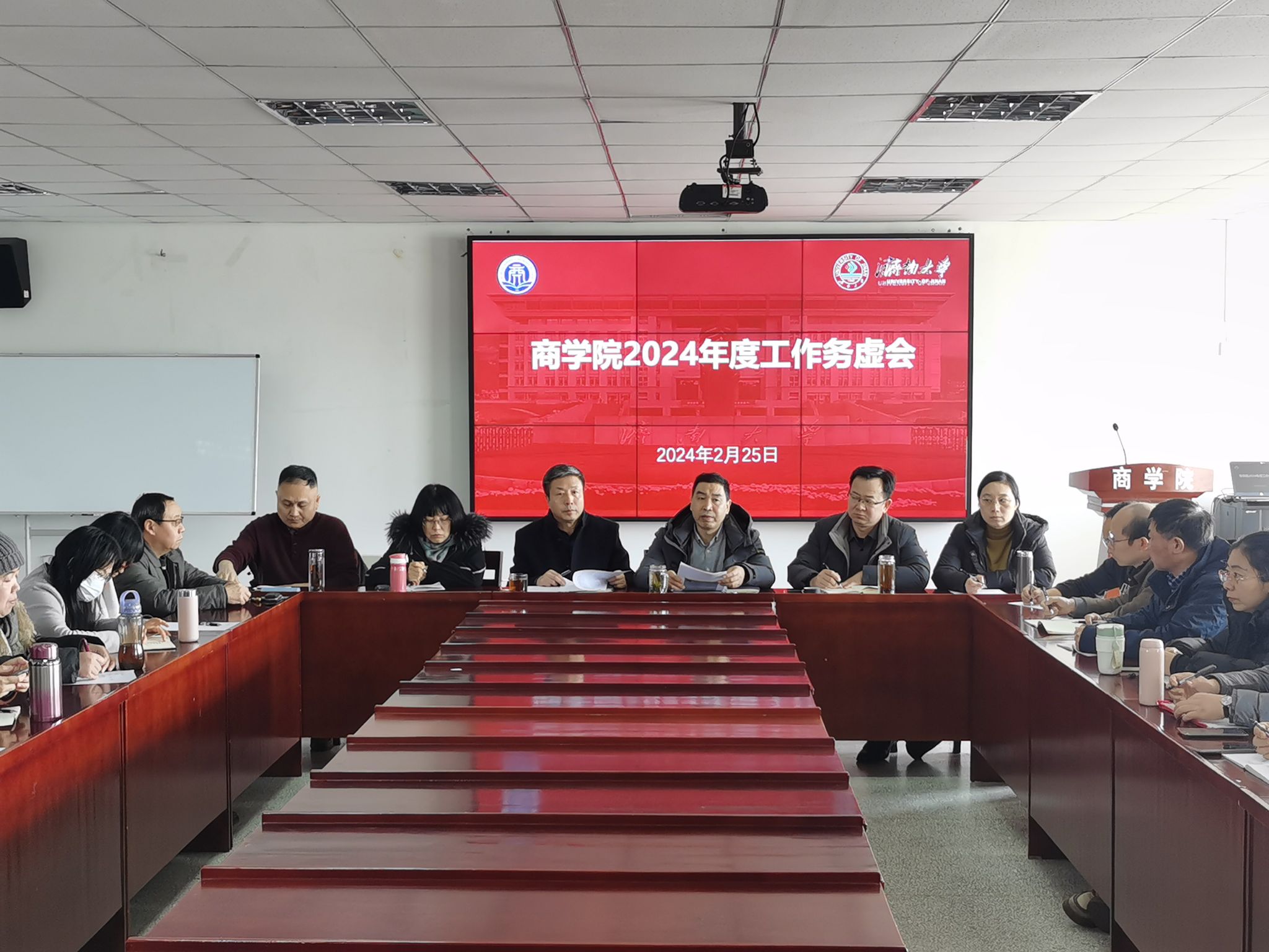 在经管楼615会议室召开2024年度工作务虚会。学院班子成员、系主任、部门负责人、学位点负责人、专业负责人、教师党支部书记和教师代表参加会议。会议由学院党委书记彭亚宁主持。