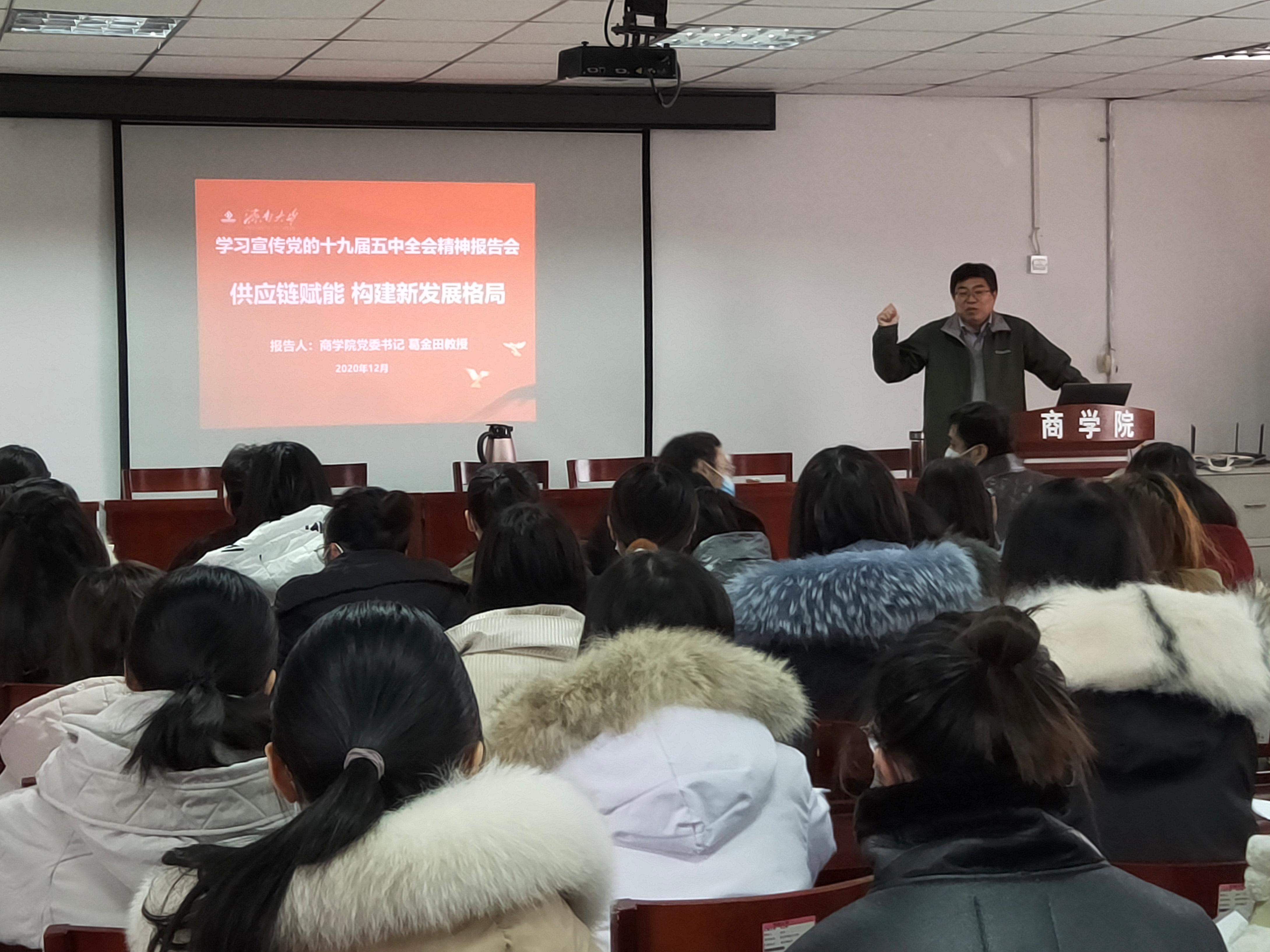 葛金田书记以“凝心聚力再出发,砥砺奋进新征程”为主题,围绕四个把握,即把握党的十九届五中全会精神内涵、把握中国经济社会发展面临的新环境、把握科学分析互联网时代经济发展新特征,以及把握供应链赋能加快构建双循环新发展格局四个关键点展开宣讲。葛书记指出,在百年未有之大变局、百年未有之大疫情、百年奋斗目标等三大背景下,数字化、大国博弈、治理重构等进一步推动社会加速变革,世界经济格局将深刻调整。他强调,在党的十九届五中全会精神的指导下,我们要结合学院实际展开工作,认真做好理论阐释和学习培训,同时,时刻保持对国内外经济形势的敏感度,准确把握国内外经济新形势,正确认识互联网时代中国经济发展新特征,进一步把握好理论研究和学习的正确方向。要求同学们要加强党的十九届五中全会精神学习,做到学深悟透,要以多途径、全覆盖、深内涵的工作思路开展学习研讨活动,经常性地谈心得、讲体会、学落实;要求同学们要统筹兼顾,把学习贯彻全会精神与各自专业相融合,服务社会经济建设,为国家多做贡献。