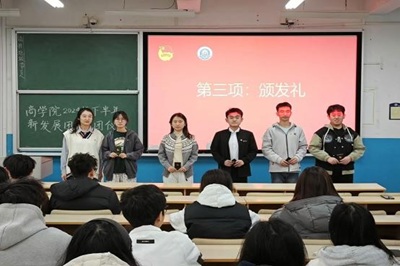 在热烈的掌声中,新发展团员代表们上台接受颁发礼,团委书记陈淑云为团员代表佩戴团徽,颁发团员证。紧接着,团员代表张新悦带领全体新团员进行入团宣誓,誓词铿锵有力,展现出新时代青年自信自强、刚健有为的精神风貌。