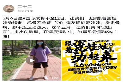 青年志愿者协会线上举办本次活动以响应由瓷娃娃罕见病中心发起的公益宣传活动,通过线上会议的方式向同学们普及成骨不全症的相关知识,同学们积极了解相关知识,并积极响应与瓷娃娃“一起运动”的号召,纷纷在社交平台上晒出自己或者自己和朋友一起运动的视频,在适度运动中为罕见骨病群体加油,同时,由于成骨不全症(osteogenesis iperfecta)简称“OI”,同学们便在视频结尾用身体拼出了“O”“I”造型,表达对成骨不全症(“OI”)病友的鼓励。