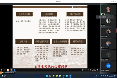 2021级全体心灵使者,开展线上“2021级心灵使者培训”活动。旨在进一步丰富心灵使者的专业知识,提高心灵使者责任感,并进一步对同学们的心理问题进行疏导。心理健康指导老师陈恺盛进行指导教育,令其明确自身工作任务,理解自身定位要求,并逐步强化心灵使者应具备的工作能力和应掌握的工作方法。