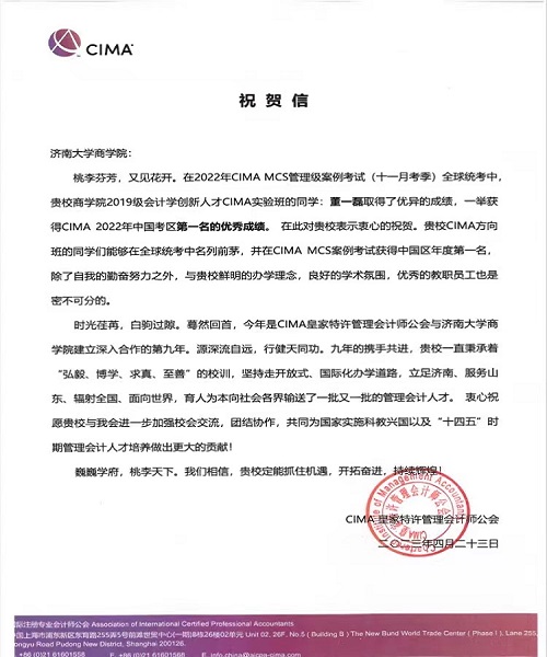 收到了CIMA(英国皇家特许管理会计师公会)发来的祝贺信,祝贺91热播