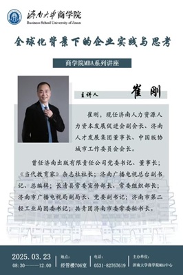 在经管楼706教室成功举办《全球化背景下的企业实践与思考》讲座。此次讲座由赵薇教授主持,特邀济南人力资源人力资本发展促进会副会长、济南市人才发展集团董事长崔刚老师主讲。崔刚老师曾任中国版协城市工作委员会会长;济南出版有限责任公司党委书记、董事长;《当代教育家》杂志社社长;济南广播电视总台副书记、总编辑;长清县常委宣传部长、常委组织部长;济南市广播电视局副局长、党委副书记;济南市第二轻工业局团委书记,共青团济南市委常委秘书长等职务,既有长时间从政经验,又有丰富的企业履历,对于全球化背景下、双循环格局下的企业实践具有深刻的思考和认识。本次讲座旨在让MBA学生提高认知能力、锻炼思维方式,更好的提升职业素养。